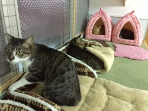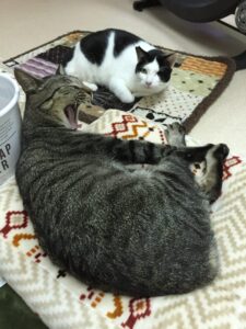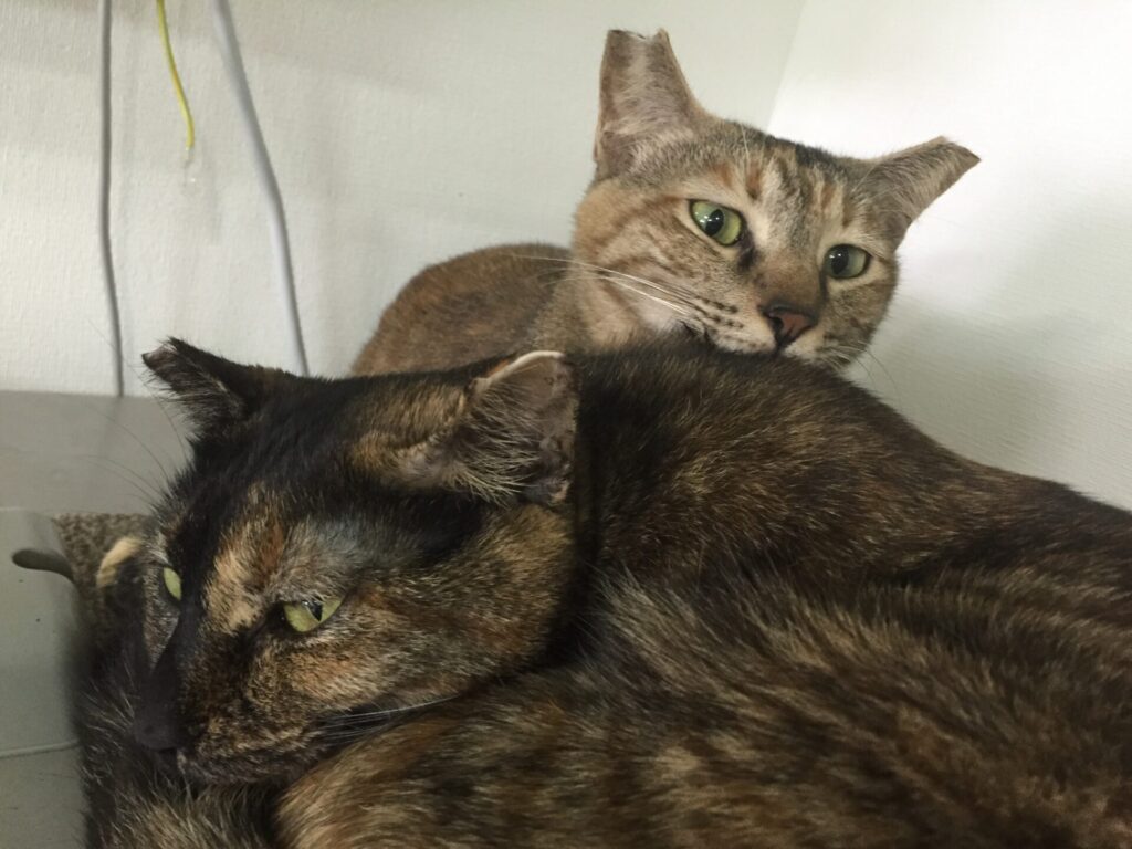 ニシマとボン。2匹とも1歳くらいのキジ猫同士。